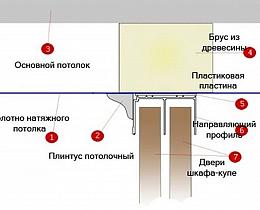 Существует два варианта установки шкафа-купе с натяжным потолком. В первом случае потолок устанавливается по всей площади помещения, на месте, где будут крепиться направляющие от шкафа устанавливают закладную конструкцию. В таком случае потолок будет и в самом шкафу. В другом случае, крепления для потолка устанавливают на закладной для шкафа, где в последствии будут крепиться направляющие. В этом случае потолок будет установлен до шкафа-купе.